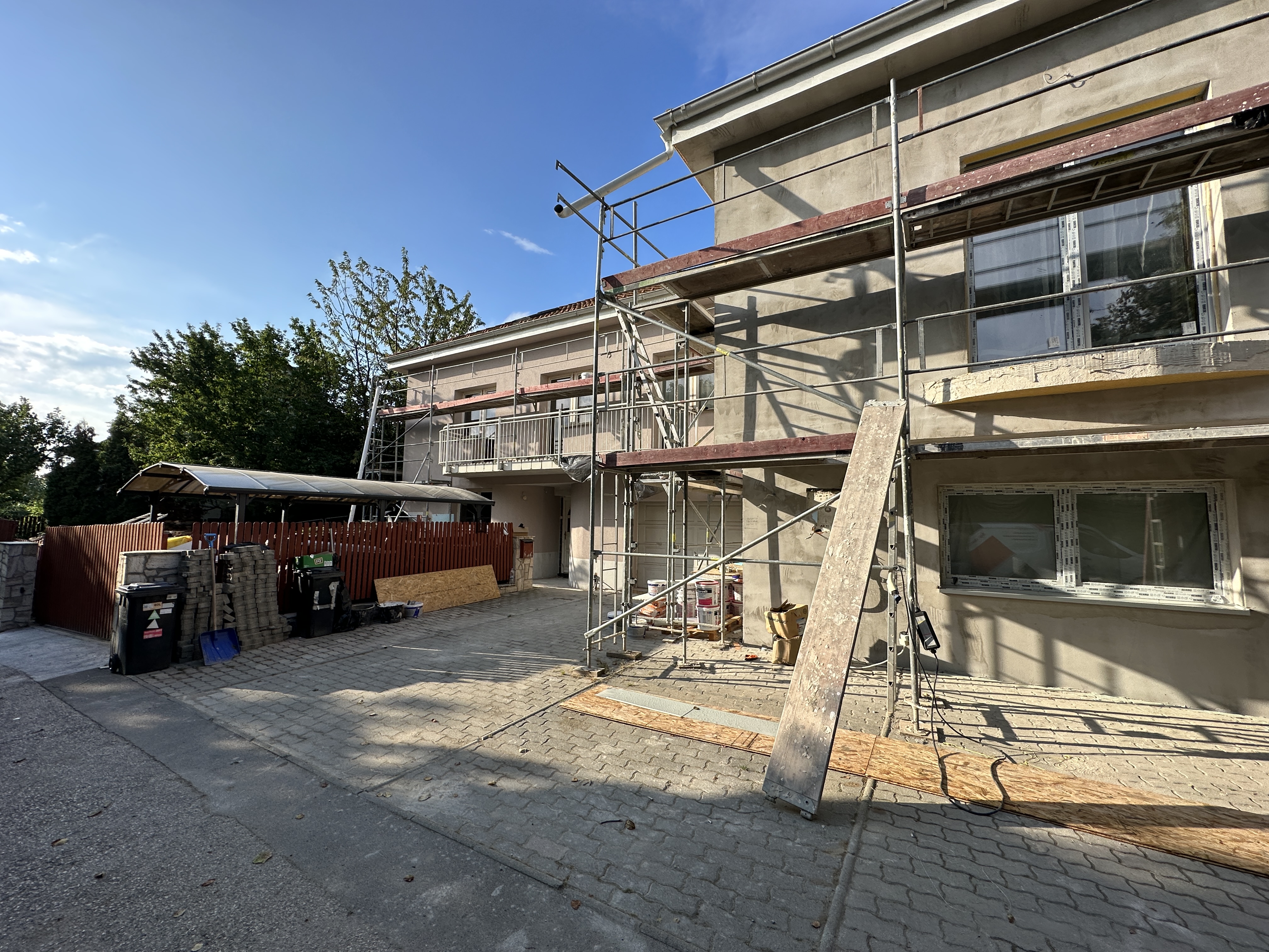 A felújítás következő ütemében az épületet körbeállványoztuk, majd teljes homlokzati hőszigetelést és színezést végeztünk. A projekt zárásaként a kültéri járda- és teraszfelületek hidegburkolását, valamint tartós és időjárásálló epoxy fugázását készítettük el.